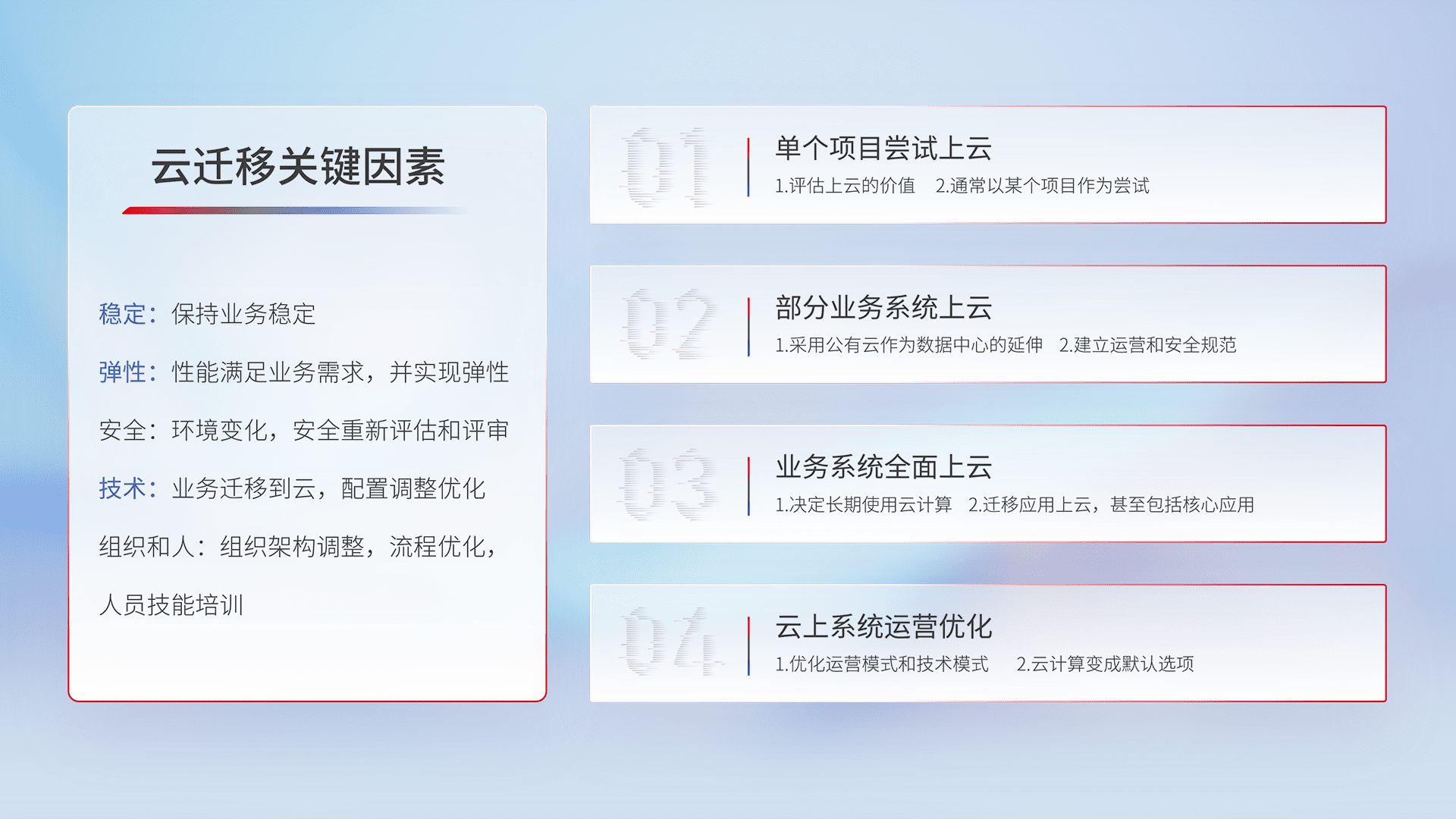 结合实际业务,,,,从规划设计、、、、云平台选型、、、云原生改造、、、、数据迁移、、、集成交付,,迁移全过程为客户识别最佳上云路径,,,做好风险识别管理,,设计网络架构、、、身份权限、、、安全审计合规、、、、操作审计、、、日志审计、、监控告警策略、、多站点容灾设计等,,,,对云上基础设施进行整体规划,,,,提升IT治理水平,,,以满足弹性、、、高可用、、、高性能的需求。。。