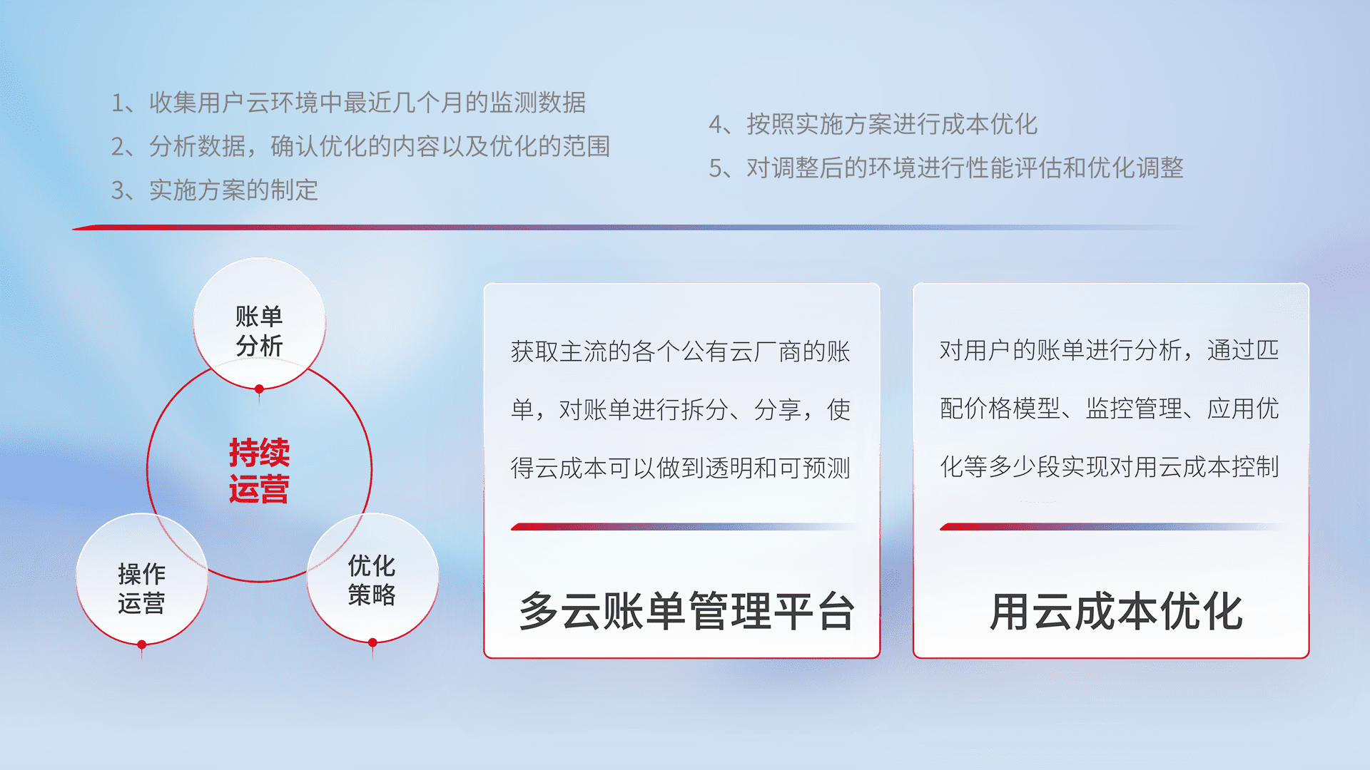 通过多云纳管,,,以统一的资源数据模型把客户的云资源进行抽象和封装,,进而实现对多云资源的统一操作,,保障云资源管理的可靠性、、稳定性与可用性。。。。量身定制化运维内容,,,,配置、、、开发运维、、补丁管理、、备份、、、监控、、认证和访问管理、、审计和日常巡检等,,,,保障在用云过程中的可靠度,,,稳定度以及高可用率。。。
